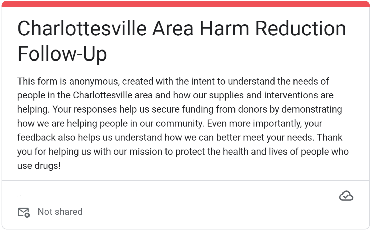 Completing this survey helps us see how many people are using our supplies. It also offers a space for anonymous testimonials and feedback, so we can learn how we are helping people and how we can improve our services.